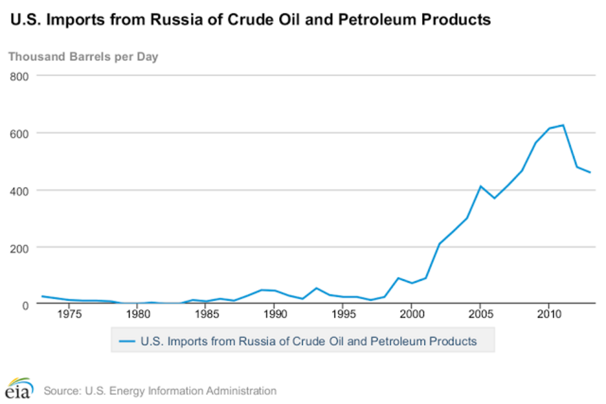 I tried to put this nonsense to rest in聽聽citing America's continuing dependence on imports which remain close to 50 percent of our true petroleum consumption. But, let me try another simpler, visual way to show how ridiculous this argument is. Jim Hansen of Ravenna Capital Management pointed to the graph shown at top left and available on the website of the U.S. Energy Information Administration. It's a graph of U.S. imports of crude oil and petroleum products from Russia.