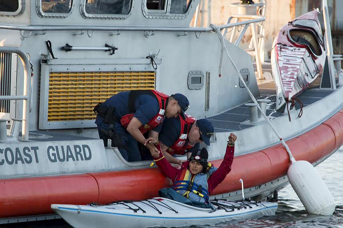 The Coast Guard picked up Kelly Mears, 28, in a yellow double kayak as he and others unfurled a massive "Shell No" banner on the water.