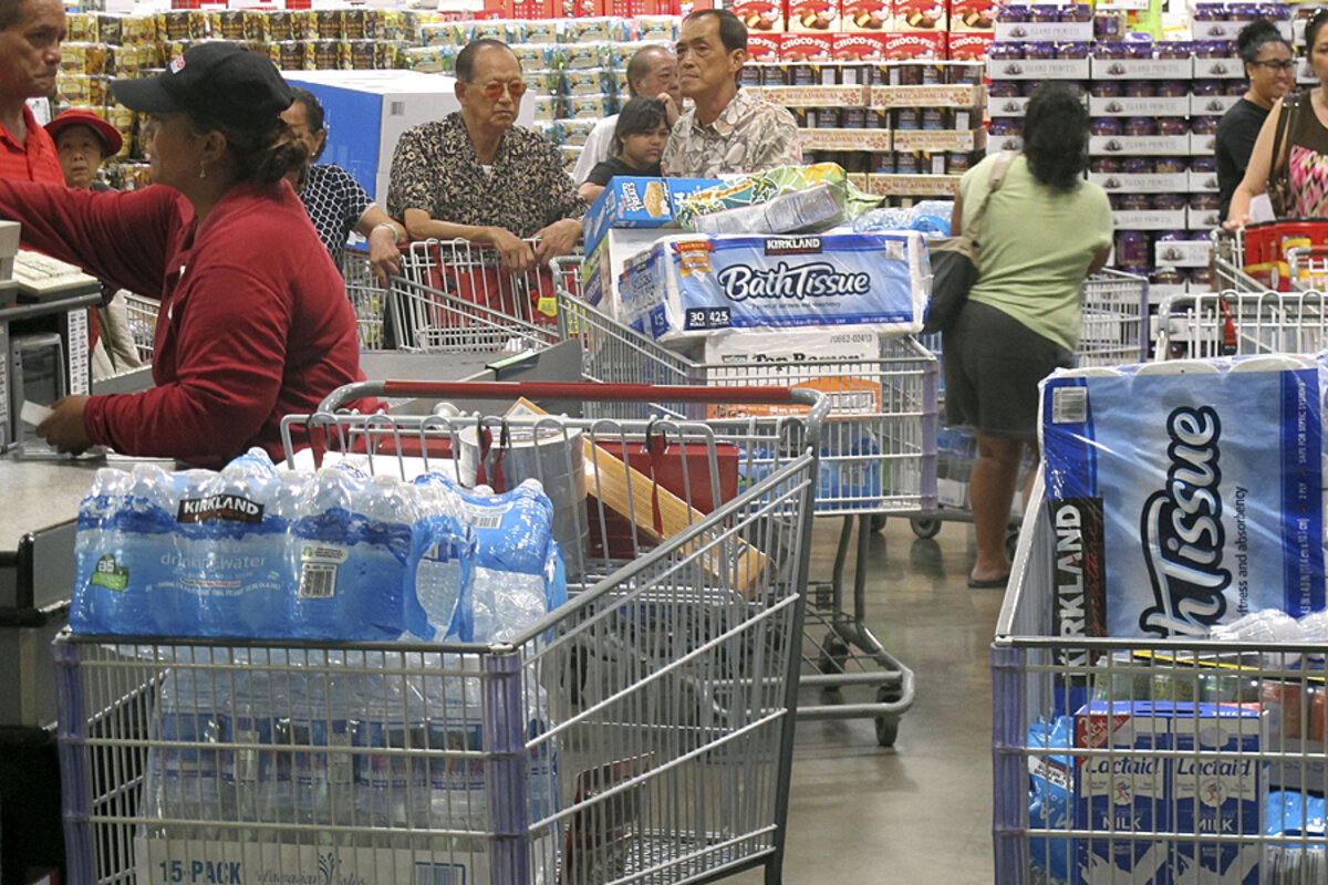 Shoppers in Honolulu waited in line at supermarkets with carts full of bottled water, batteries and nonperishable food items.