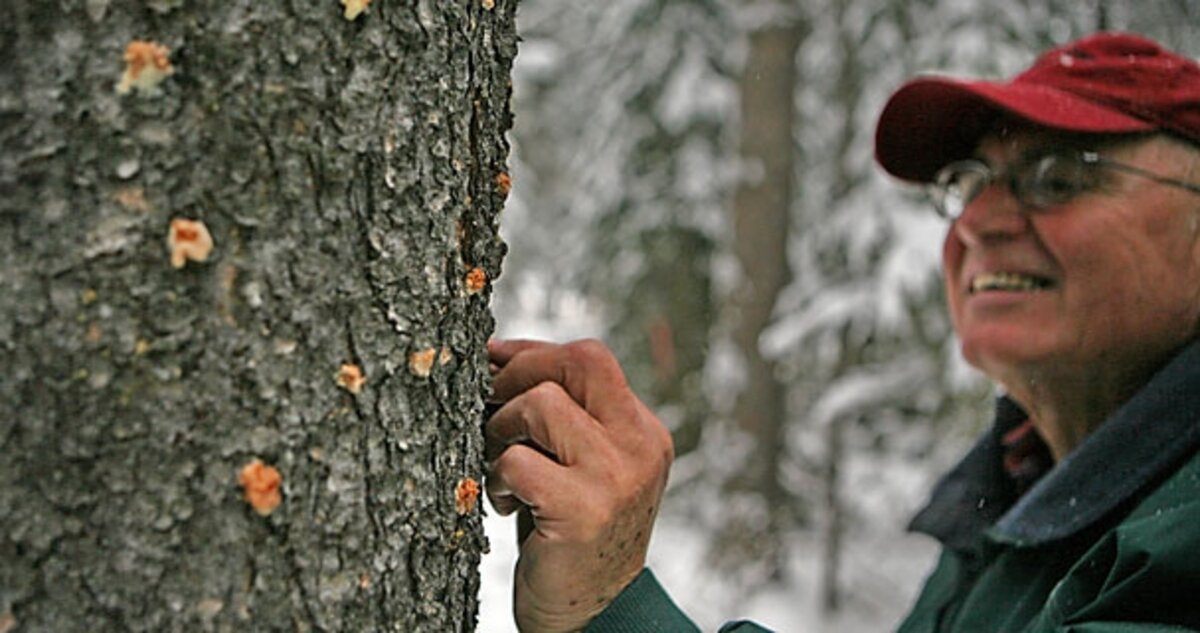 He points to a trunk riddled with pitch-outs 鈥 ejections of sap sent out by the tree trying desperately to dislodge the bark beetles that are killing it. The branches are covered in rust-colored needles that have faded from their original healthy green as the beetle attack cuts off the tree鈥檚 food and water. These are the visible scars of massive beetle destruction that now stretches from Colorado to British Columbia.