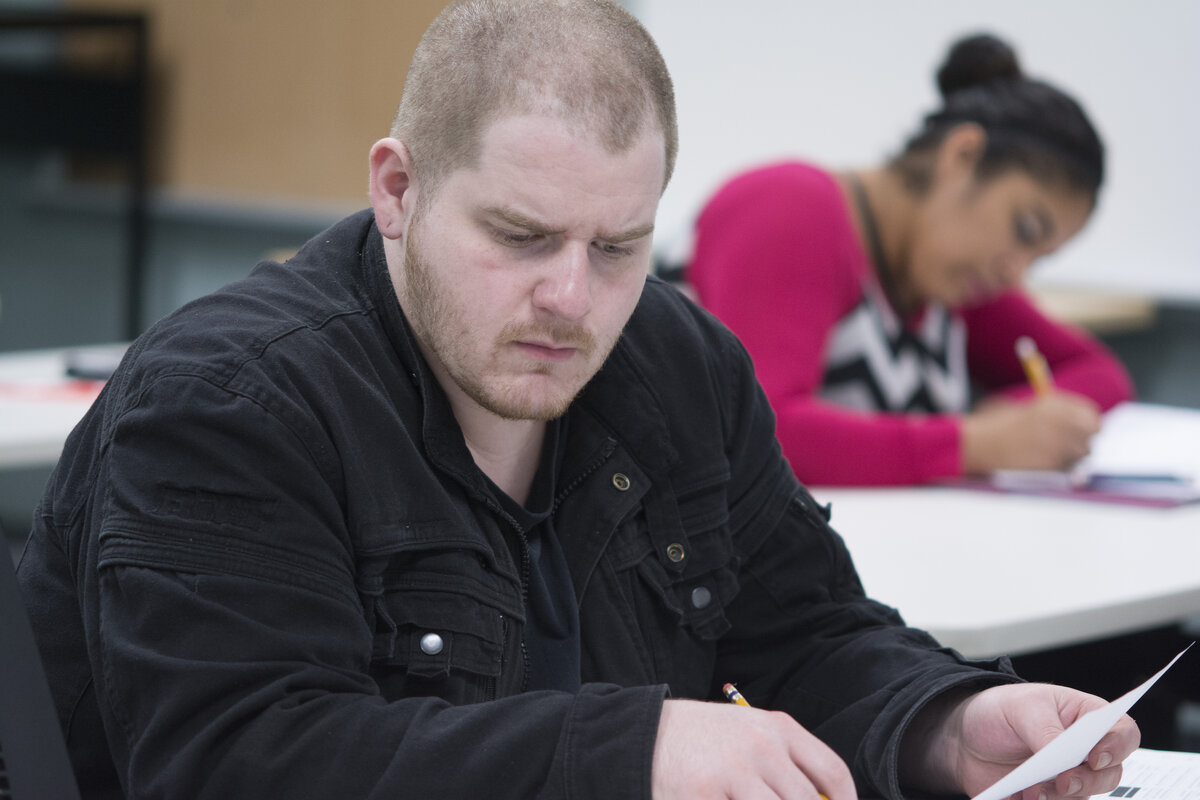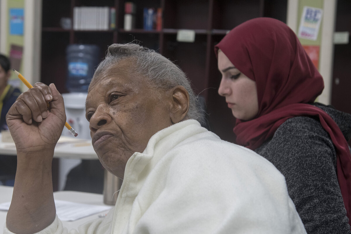 For some families, there鈥檚 a three- or four-generation impact. Gladys Briars and her grandson Ocean Farley sit side by side working on math problems at the W. 34th street campus. She鈥檚 77, he鈥檚 21, and he鈥檚 got a baby boy on the way.