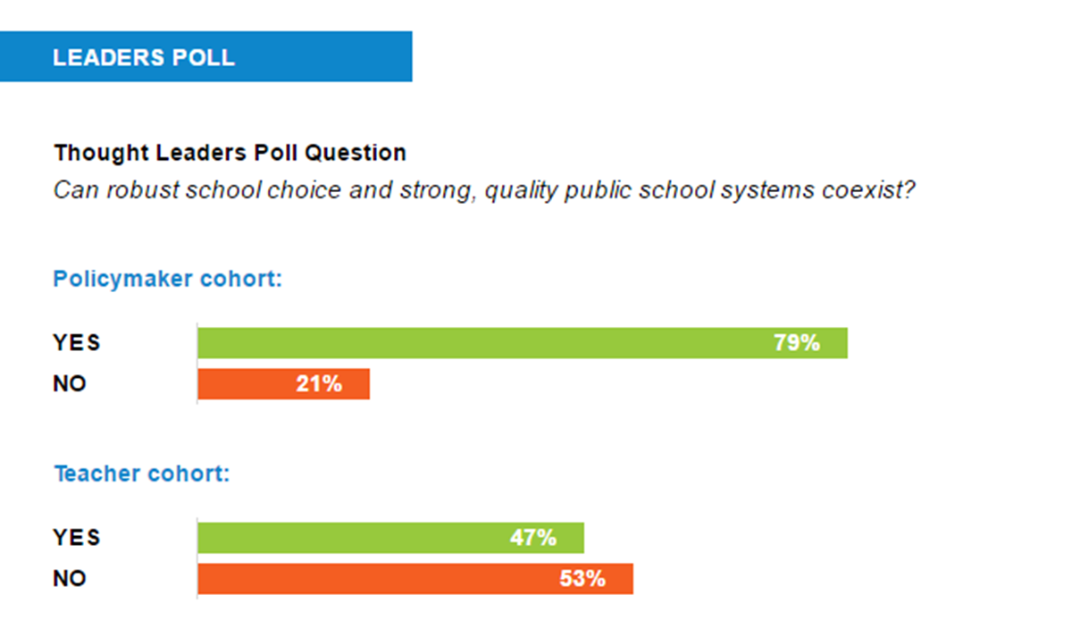 Seventy-nine percent of policy influencers who responded to our poll said yes, as long as a school system was properly set up and regulated, students could benefit from school choice options like charters and private schools competing with traditional public schools, and sharing best practices. Their two biggest caveats were that all schools had to have equal accountability and that there were limits on private school vouchers. Meanwhile, teachers were more skeptical, with their main argument being that school choice drains funding from public schools because money follows children to whichever school they go.