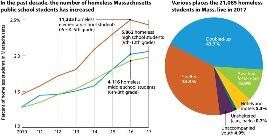 Zooming in on Boston, the problem is even starker. In 2017, more than 3,550 of the 56,000 students in the city's school district聽are homeless 鈥 a sharp spike from 1,500 homeless students in 2009. Advocates say these figures are likely an underestimate because many homeless families are too afraid or embarrassed to identify their situation to school or city officials.