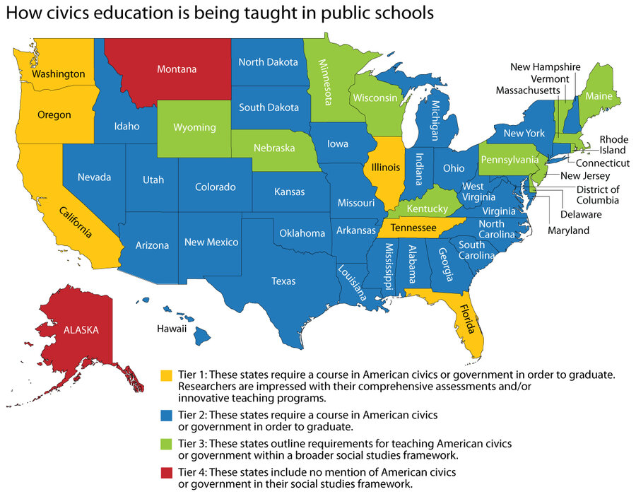 With no cohesive nationwide policies regarding civics, comparing learning requirements between states听is difficult.