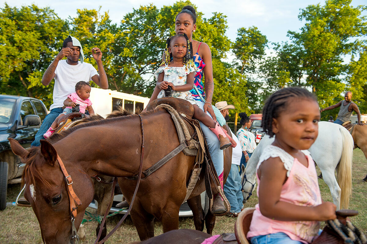 On a recent Saturday, it was rodeo night in Owasso, 10 miles north of Tulsa. Rande drives a pickup truck and horse trailer, while Moment follows with the girls in her dented gray Camry. The sun is setting behind a hill overlooking a ploughed fenced field flanked by a rusted green bleacher, as scores of riders and horses gathered by the pens. The crowd in the bleachers is a mix of families, black and white, and young and old cowboys; the air is thick with sweat and dung and hay, and a sweet smell of another kind of grass.