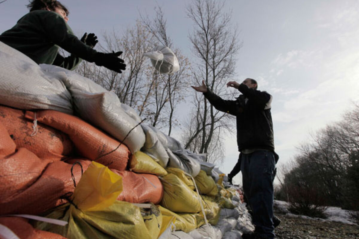 Volunteers were sandbagging on a blustery day to help stop flooding from a drainage system in a south Fargo neighborhood.