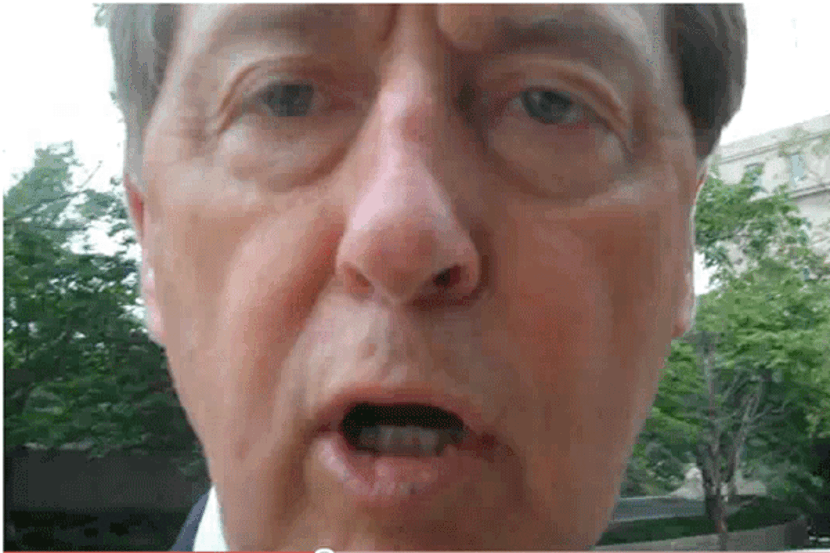 The video is interspersed with several screens of text, including: "What happens when a US congressman meets a college kid on a street in Washington?" and a few frames later, "He goes BERSERK!"