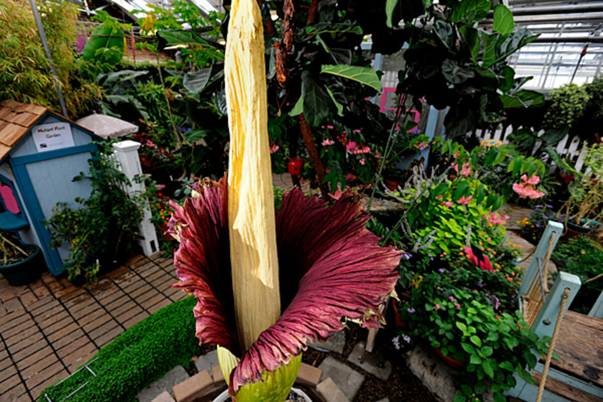 The 5-foot-tall Amorphophallus titanum that flowered Friday for the first time in 15 years is expected to finish blooming Tuesday.