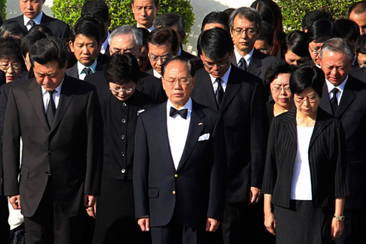 Hong Kong leader Donald Tsang and hundreds of citizens bowed their heads as both the Chinese and Hong Kong flags were raised and then lowered to half-mast in a downtown square. Residents elsewhere in the city also paused to pay their respects.
