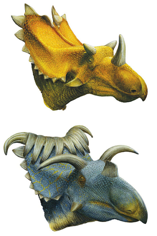The researchers say the ornate bone structures the two animals displayed likely evolved to attract females and ward off competitors for their attention, rather than for defense.