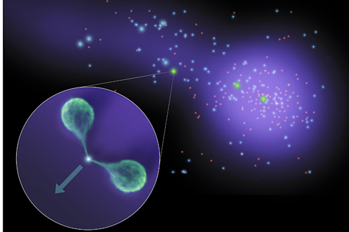 The new bent galaxy sits inside that filament, about 11 million light-years from the center of Abell 1763. Researchers discovered it using two different ground-based instruments 鈥 the WIYN Observatory near Tucson, Ariz., and the Very Large Array near Socorro, N.M.