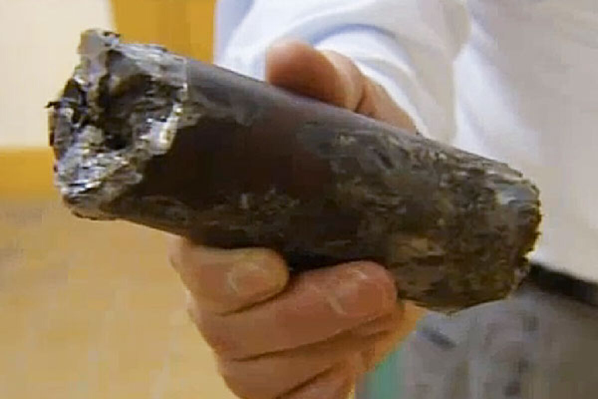 The chunk of metal appears about the same size and shape as a tall, skinny soda can, but the silvery cylinder has a tarnished look to it.