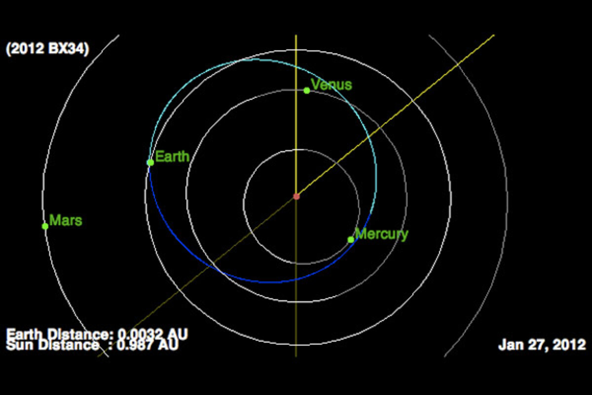 Asteroid 2012 BX34 will zip by at a distance about 0.17 times that separating Earth and the moon. The moon orbits Earth at an average distance of about 240,000 miles (386,000 km). []