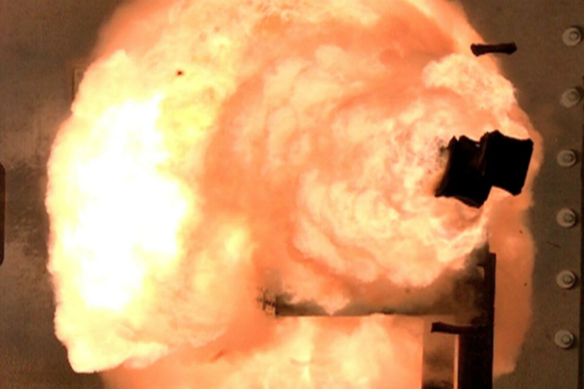 Newly released video shows the using an electric-powered launcher rather than gunpowder to fire a huge hypersonic bullet in a cloud of flame and smoke. The Office of Naval Research hopes its new test phase 鈥 scheduled to last until 2017 鈥 leads to a capable of hurling 40-pound projectiles at speeds of 4,500 mph to 5,600 mph over 50 to 100 miles (7,240 to 9,010 kilometers per hour over 80 to 161 kilometers).