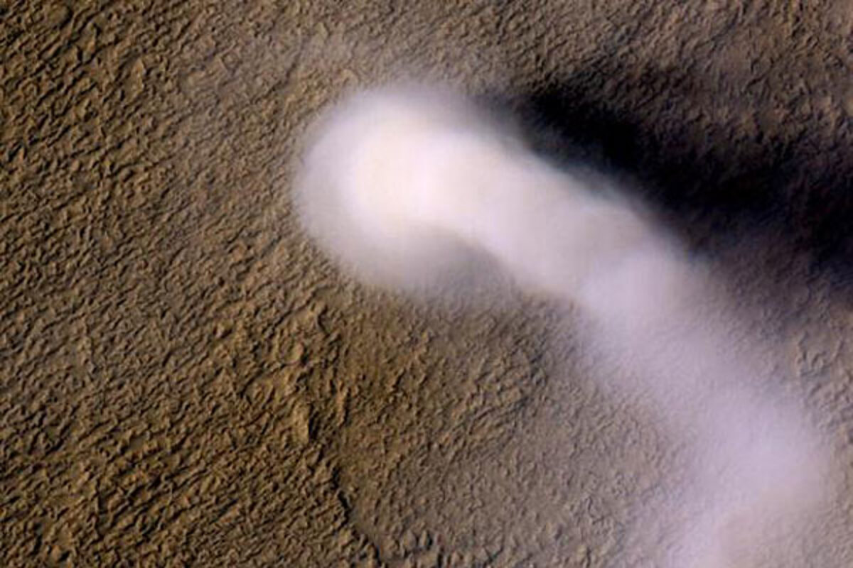 A gigantic dust devil races across the surface of Mars in a stunning new photo snapped by a NASA spacecraft.