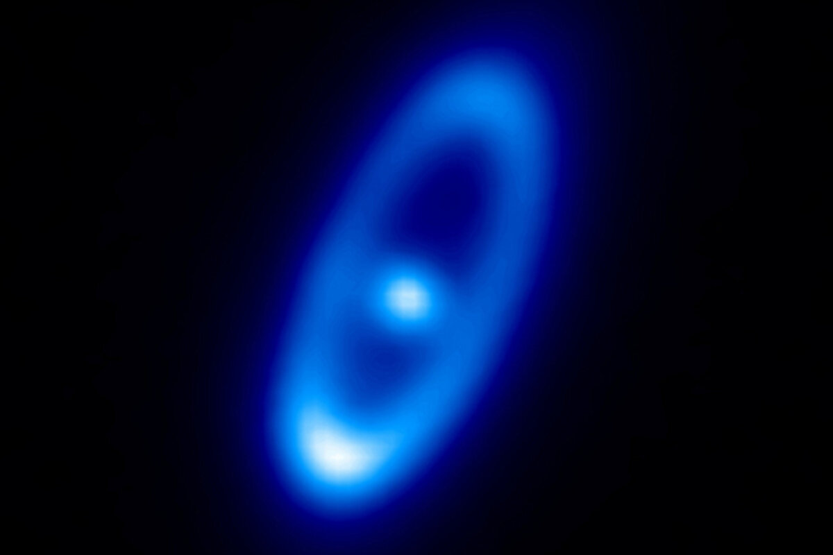 One side of Fomalhaut's dust belt is warmer than the other because it is off-center, possibly due to the gravitational influence of a planet. A by the Hubble Space Telescope in 2005.
