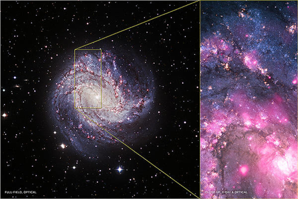 In the accompanying image, the left is an optical view of M83. On the right is a composite image showing X-ray data from Chandra in pink and optical data from the Hubble Space Telescope in blue and yellow. The ULX is located near the bottom of the composite image.聽