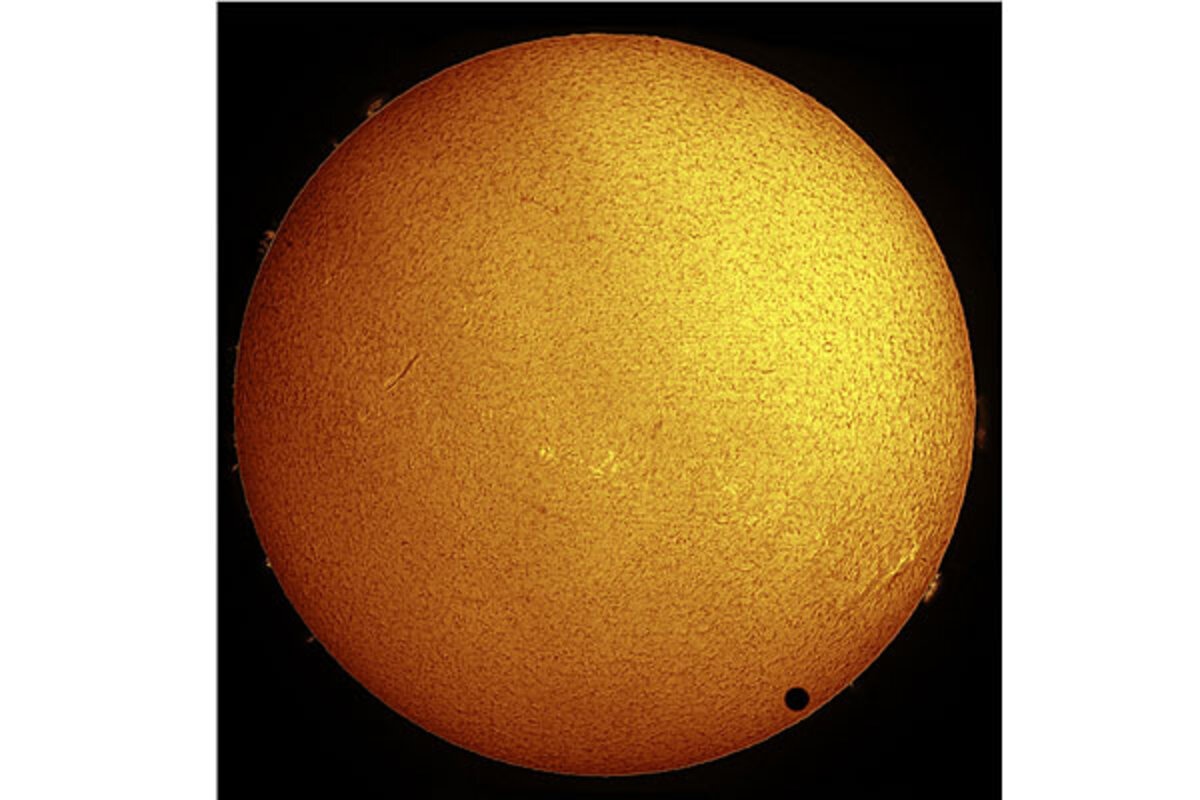 Unlike transits of the sun involving the planet Mercury, those of Venus are readily visible with the unaided eye; the planet appears as a distinct 鈥 albeit tiny 鈥 black spot with a diameter just 1/32 that of the sun.聽This size is large enough to readily perceive with the naked eye. []