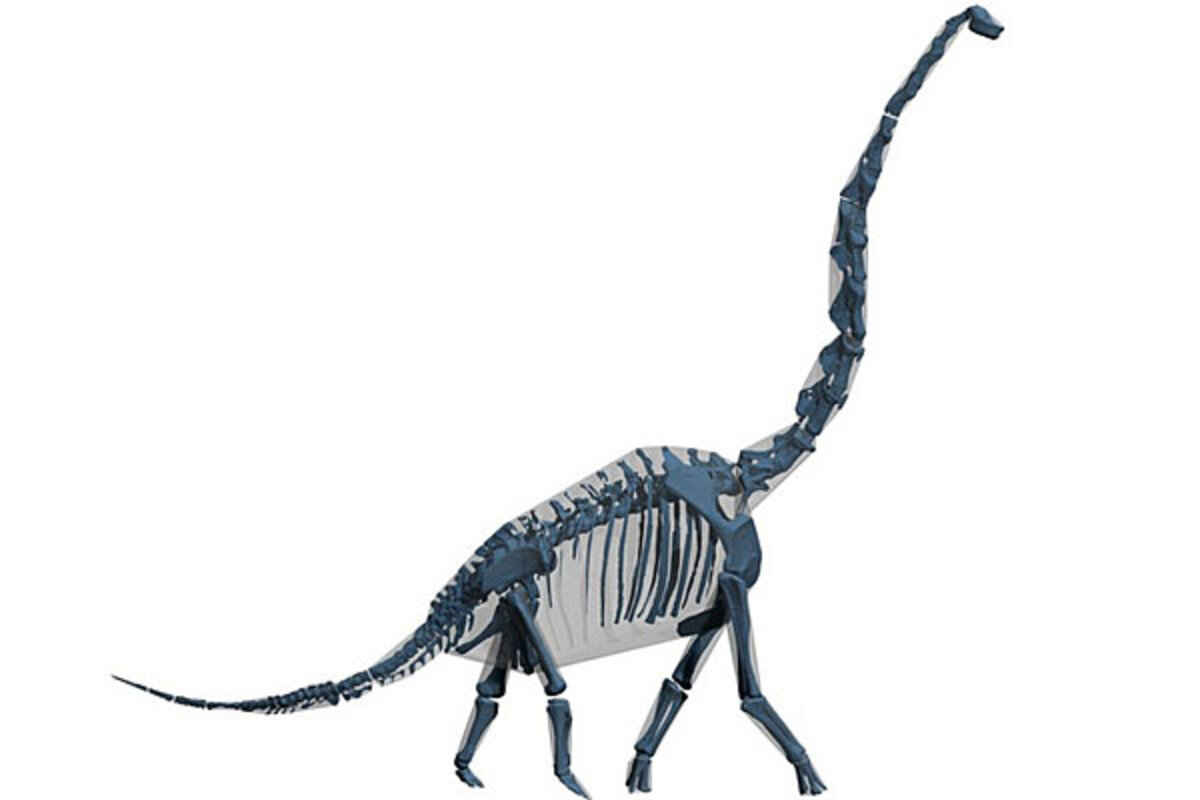 The researchers then used the same laser-scan technique on the Berlin听Brachiosaurus, a nearly complete skeleton of the large sauropod. When they calculated the wrapping volume and added 20 percent, they found the big dinosaur came in at around 25 tons (almost 23 tonnes; a ton is 2,000 pounds and a tonne is 1,000 kilograms).