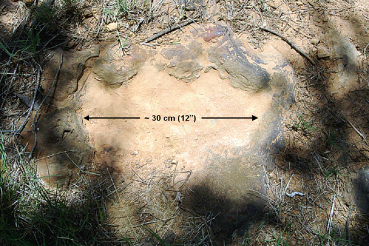 The dinner-plate-sized footprint bears the mark of four dino toes. It belongs to a nodosaur, a tank-like, armored beast studded with bony protuberances that roamed the area about 110 million years ago during the Cretaceous period, which lasted from about 125 million to 65 million years ago. Nodosaurs were plant-eaters, and this one appeared to be moving quickly across the Cretaceous mud, as its heel did not sink deeply into the ground. []