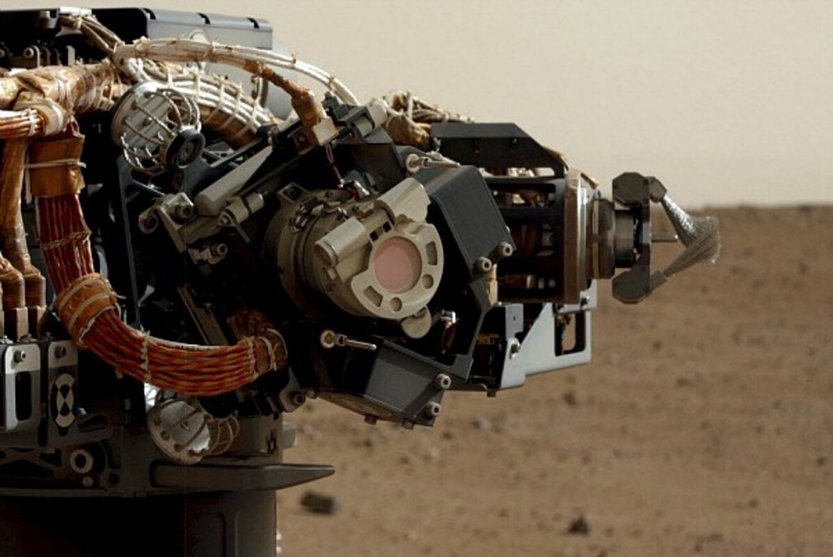 On Earth the arm weighs more than 150 pounds and sports a 73-pound turret on the business end. The turret hosts two instruments 鈥 a camera that serves as a geologist's magnifying glass and a spectrometer that uses x-rays and alpha particles to analyze the chemical make-up of rocks. In addition the turret also sports a drill, a dust-removal tool, and hardware to scoop soil and drill samples and send them to chemistry labs inside Curiosity's body.