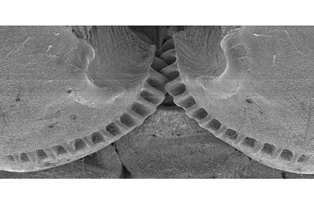 Upon closer examination using a microscope, the "teeth" were revealed to be part of curved gear- or cog-like strips found on each hind leg. And just like a cog, the teeth appeared to intermesh with one other, like on the gears of a bicycle.