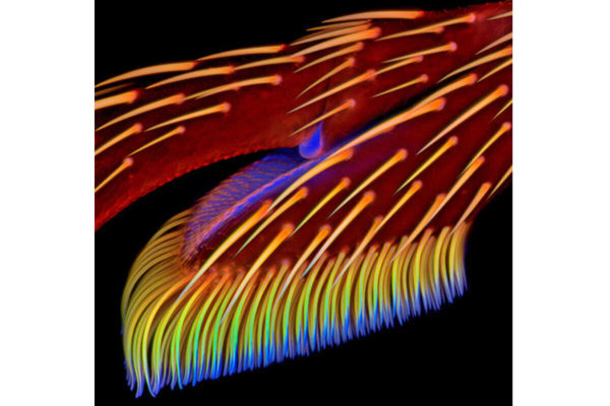 Other scientific subjects among the 100听听included an excited neuron, a chameleon embryo, a butterfly's coiled tongue, an adhesive pad on a ladybug's leg, the splash of colorful crystals that form in battery leakage and pearly dewdrops clinging to a spider web.