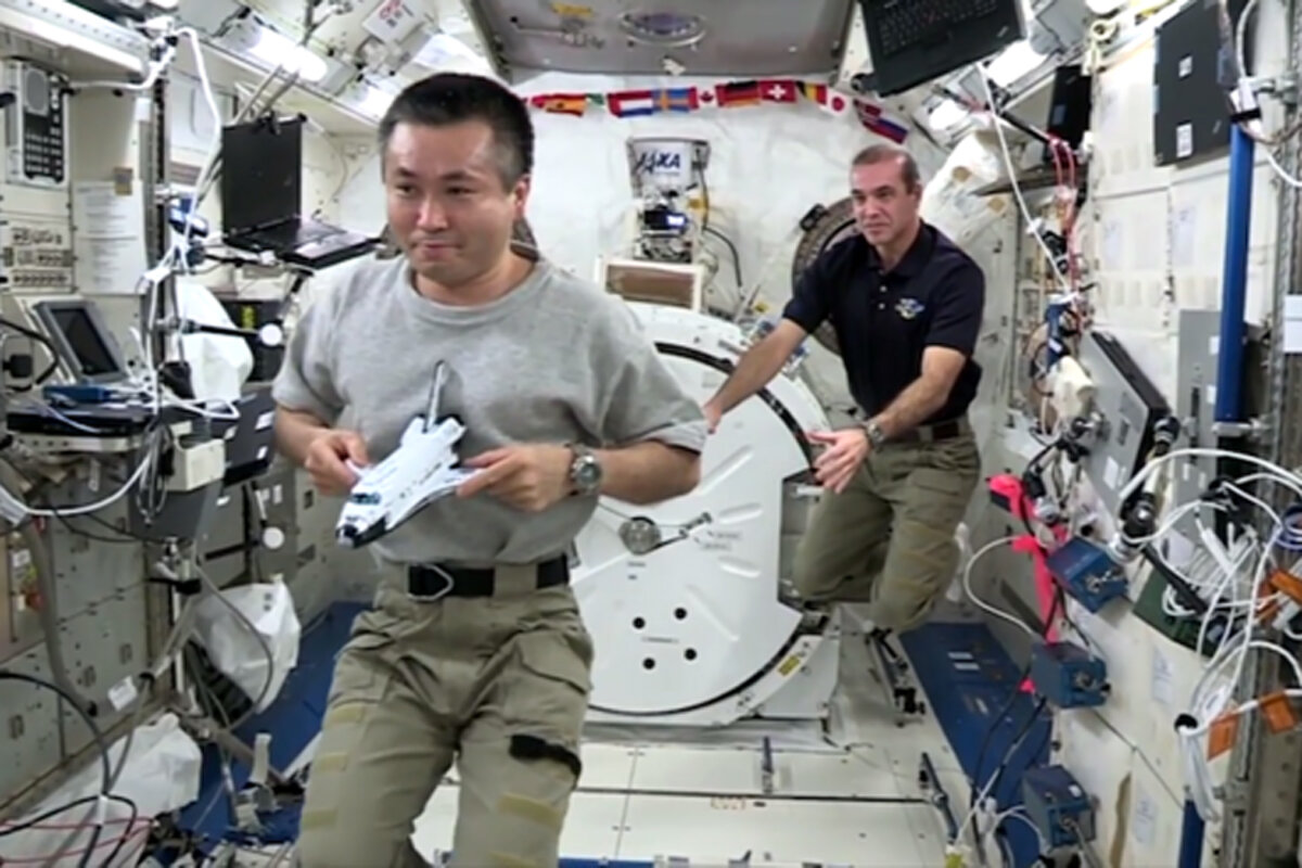 Newton's law states that every action produces an equal and opposite reaction. To demonstrate this, Mastracchio pushes his colleague Japanese astronaut Koichi Wakata, commander of the International Space Station, along with a model of NASA's now-retired space shuttle. As Wakata and the model spacecraft float forward, Mastracchio drifts backwards.