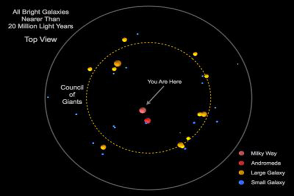 It turns out that our Local Group 鈥 a cluster of 54 galaxies dominated by the Andromeda galaxy and our own Milky Way galaxy 鈥 is encircled by twelve large galaxies.聽