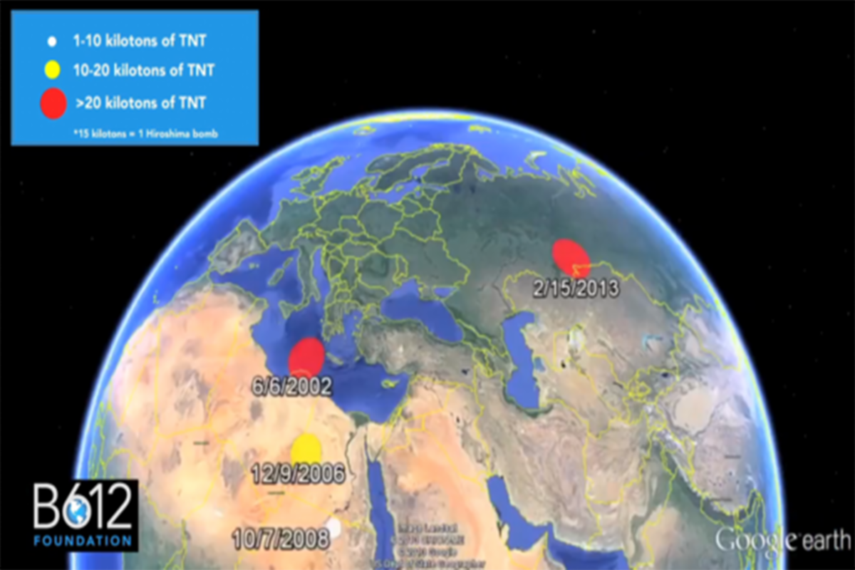 The video is based on new data from a network of sensors around the globe that is designed to detect nuclear detonations and is operated by the Nuclear Test Ban Treaty Organization. Between 2000 and 2013,听these instruments detected 26 explosions on the planet ranging in energy from 1 to 600 kilotons, all caused by asteroid impacts, B612 Foundation officials said. For comparison, the nuclear bomb that flattened Hiroshima in 1945 burst with the energy of 15 kilotons. []