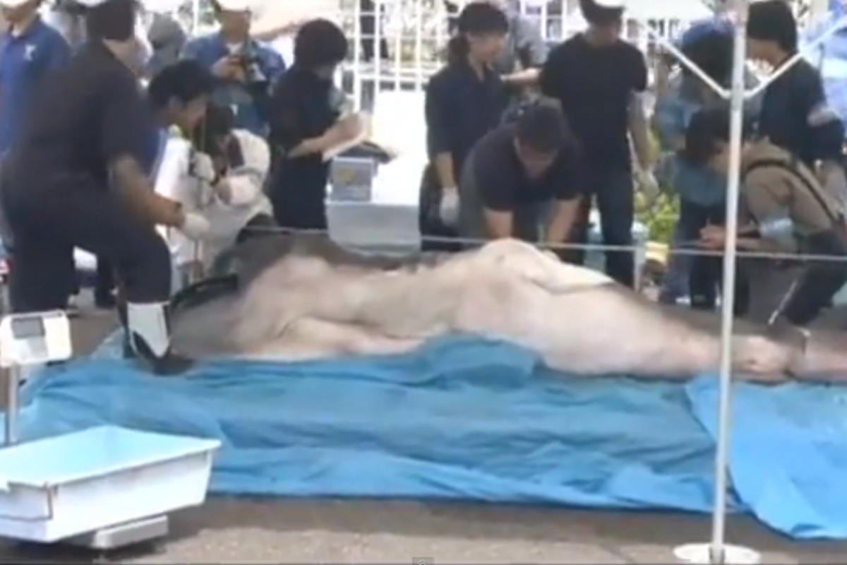 A 13-foot long female megamouth shark weighing nearly 1,500 pounds caught off the coast of Japan was dissected before thousands of onlookers at the Marine Science Museum in Shizuoka City Thursday. The creature was caught by fishermen from a depth of 2,600 feet.
