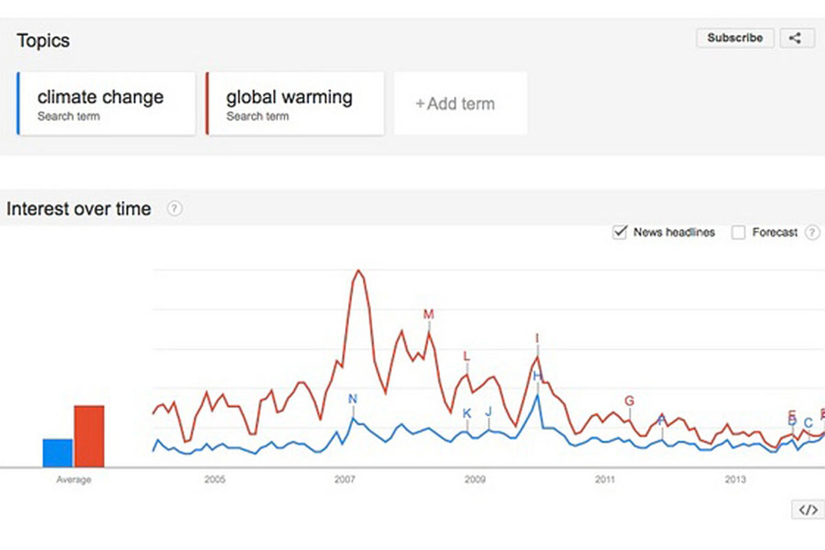 Google Trends reveals that, historically, Internet users have searched more for "global warming" than "climate change," but the gap has closed in the past couple of years.