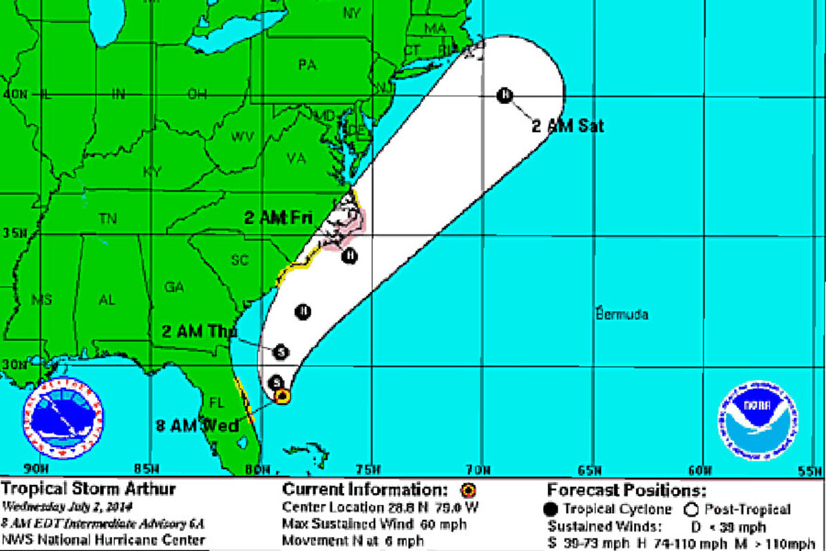But if you're planning to watch fireworks or picnic on Friday July 4, that's a difference without much meaning. Either way, the East Coast is forecast to experience rain and high winds. How much rain or wind will depend how close Arthur comes to the coast.