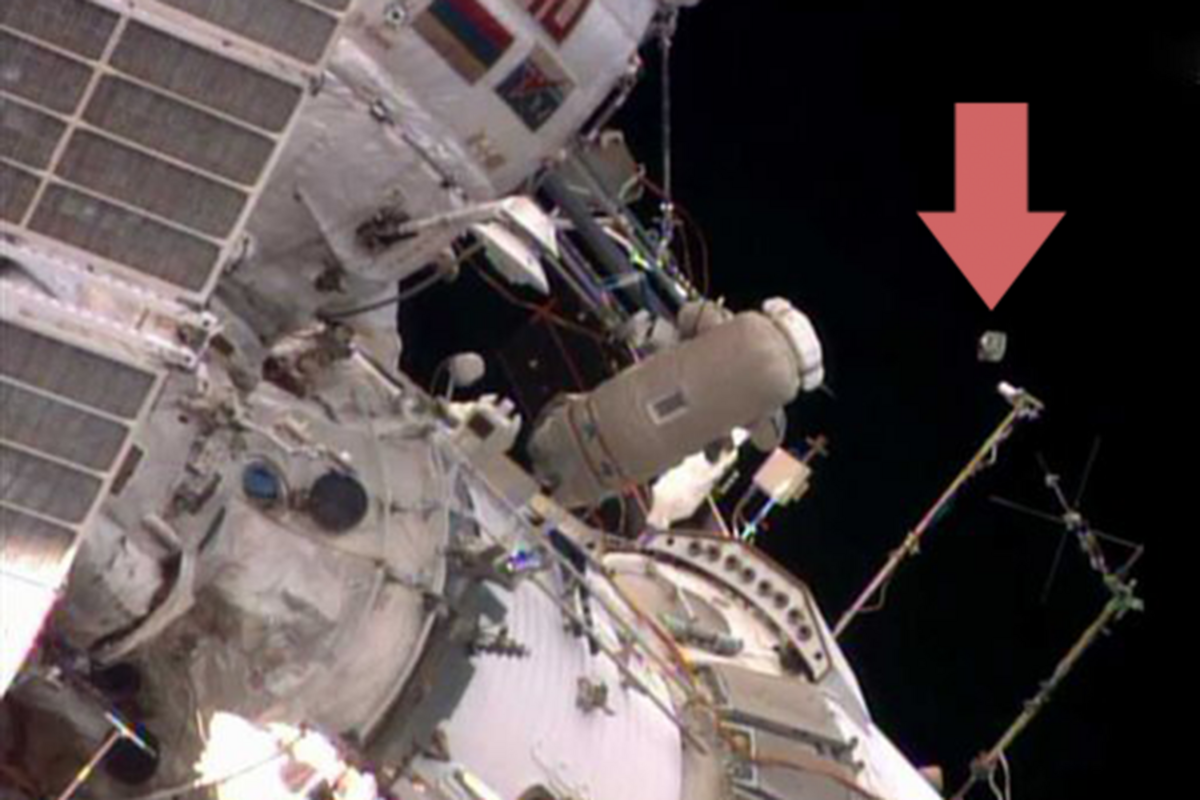 Russian Oleg Artemiev cast the 4-inch box off with his gloved right hand as the International Space Station sailed 260 miles above the cloud-flecked planet. The nanosatellite gently tumbled as it cleared the vicinity of the orbiting complex, precisely as planned.