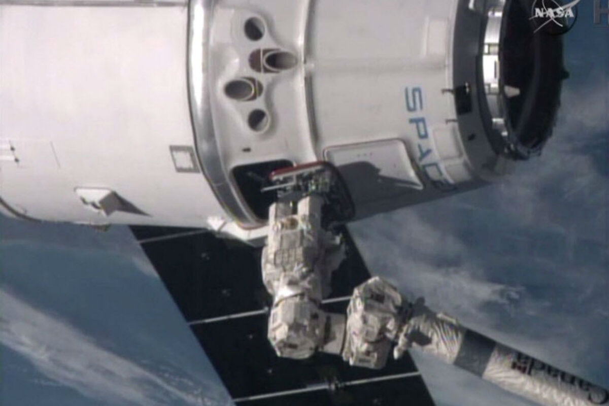At 5:54 a.m. ET Monday, the capsule was lurking some 32 feet from the orbiting outpost, a final holding point before docking. The station's commander and former US Navy test pilot Barry Wilmore and European Space Agency astronaut Samantha Cristoforetti used the station's robotic arm to gently grasp the capsule and pull it into its docking port some 18 minutes ahead of schedule.