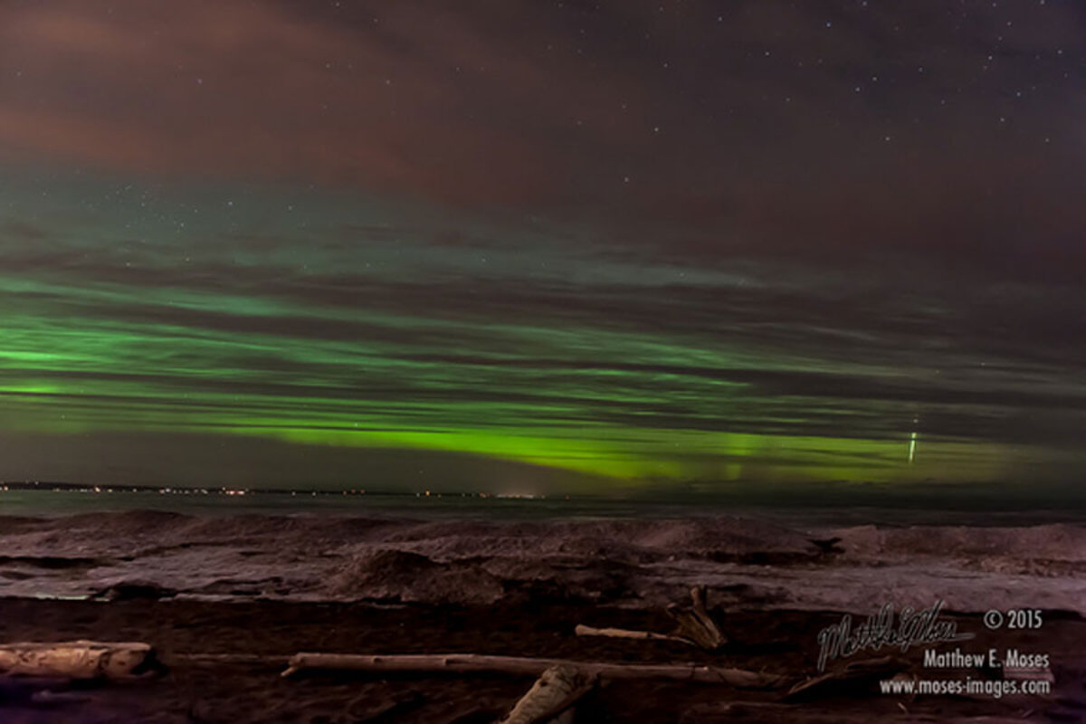 "Just before midnight I saw a flash of a meteor as I was out photographing the northern lights," Moses told Space.com via email. "Luckily my shutter was open so I anxiously checked the back of the camera and sure enough at 11:55 CST a meteor shows as a bright streak in the Eastern edge of the green aurora band. This was seen from the shore of Lake Superior out on Wisconsin Point just outside Superior, WI."