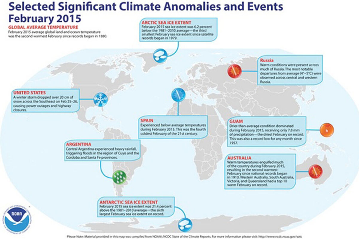 "In February 2015, cooler to much-cooler-than-average conditions overtook the entire eastern half of the United States and the eastern third of Canada, with some record-cold pockets seen around the Great Lakes region and part of northeastern Canada near Hudson Bay," NOAA scientists wrote in the report.