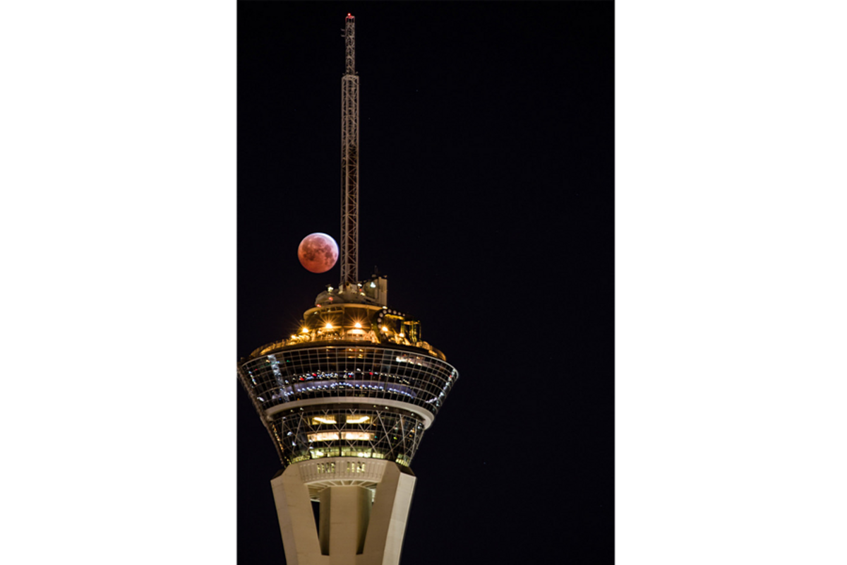"Ran out this morning to catch the lunar eclipse. I was trying to compose this shot for quite some time to get it right," Leavitt wrote in an email to Space.com. 听"This is the 'Stratosphere' tower/casino in Las Vegas with the fully eclipsed moon in the background."