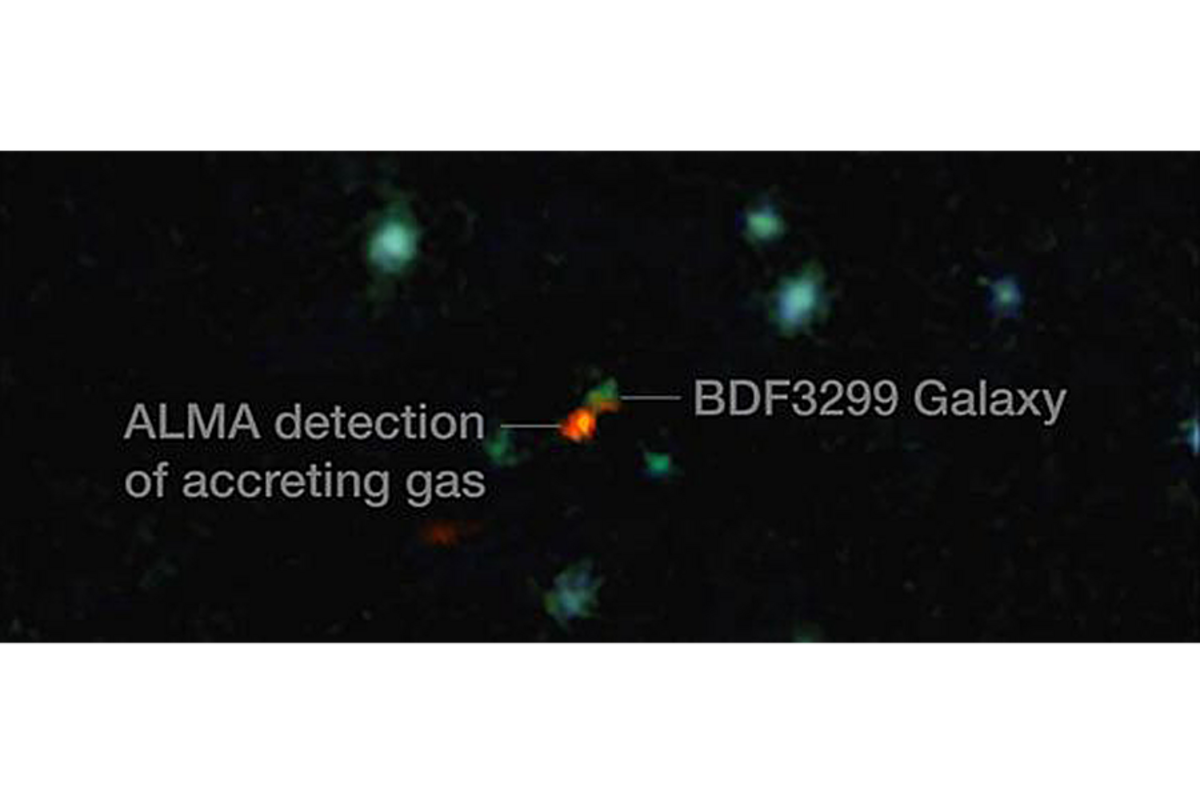 In the new image, researchers were able to make out the glow of ionized carbon (shown in red) in the process of assembling into a galaxy 鈥 called BDF 3299 鈥 around 800 million years after听. The carbon cloud is overlaid on another picture of the galaxy's neighborhood, where you can tell the galaxy itself is off to the right. Researchers think that carbon's glow is obscured by the supernova blasts and chaos of galactic formation there, but the cold store of carbon nearby still shines as the galaxy draws from it.