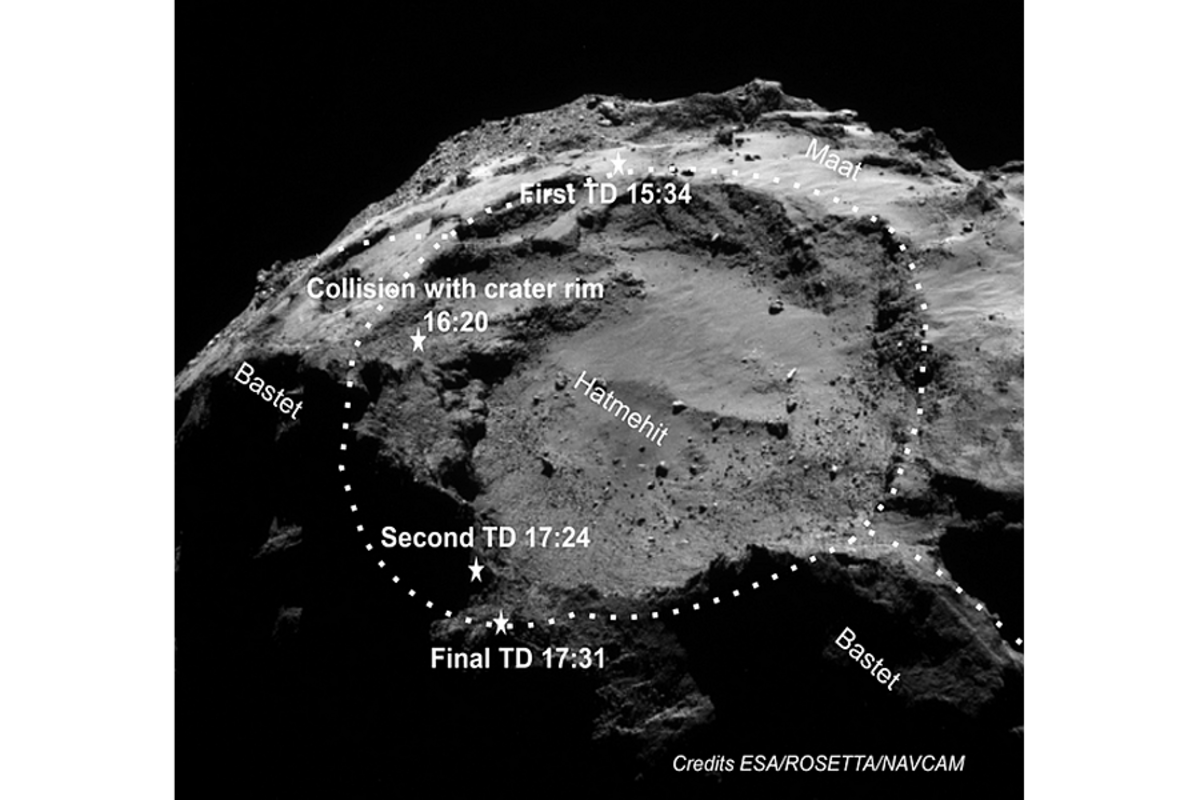 The historic touchdown didn't go exactly as planned, however. Philae's anchoring harpoons failed to fire, and the 220-lb. (100 kilograms) lander bounced off 67P's surface, clipped a crater rim and then bounced a second time before finally coming to rest nearly two hours after first making contact with the comet's surface. []