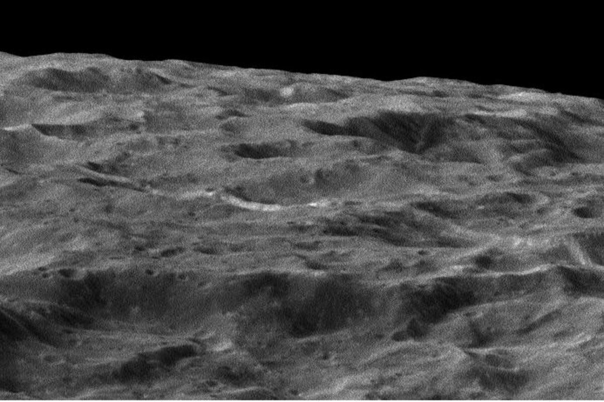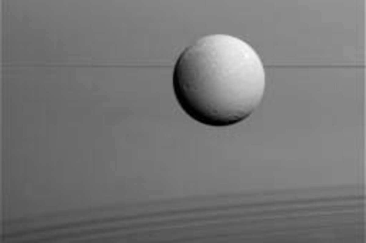 The spacecraft passed above Dione鈥檚 surface Monday at a mere 295 miles, making it the fifth close encounter with the moon during its mission at Saturn. It made its closest flyby around Dione in December 2011 at a distance of 60 miles. The images arrived on Earth Thursday.