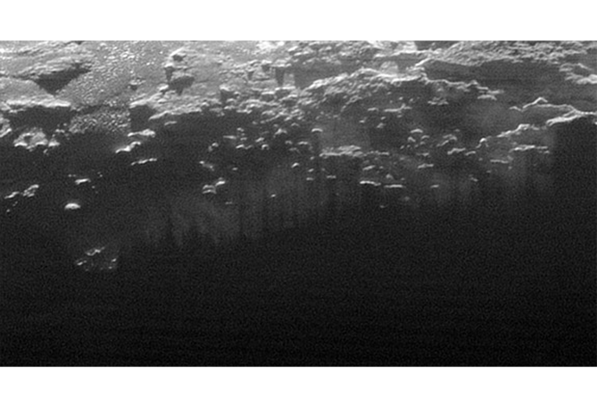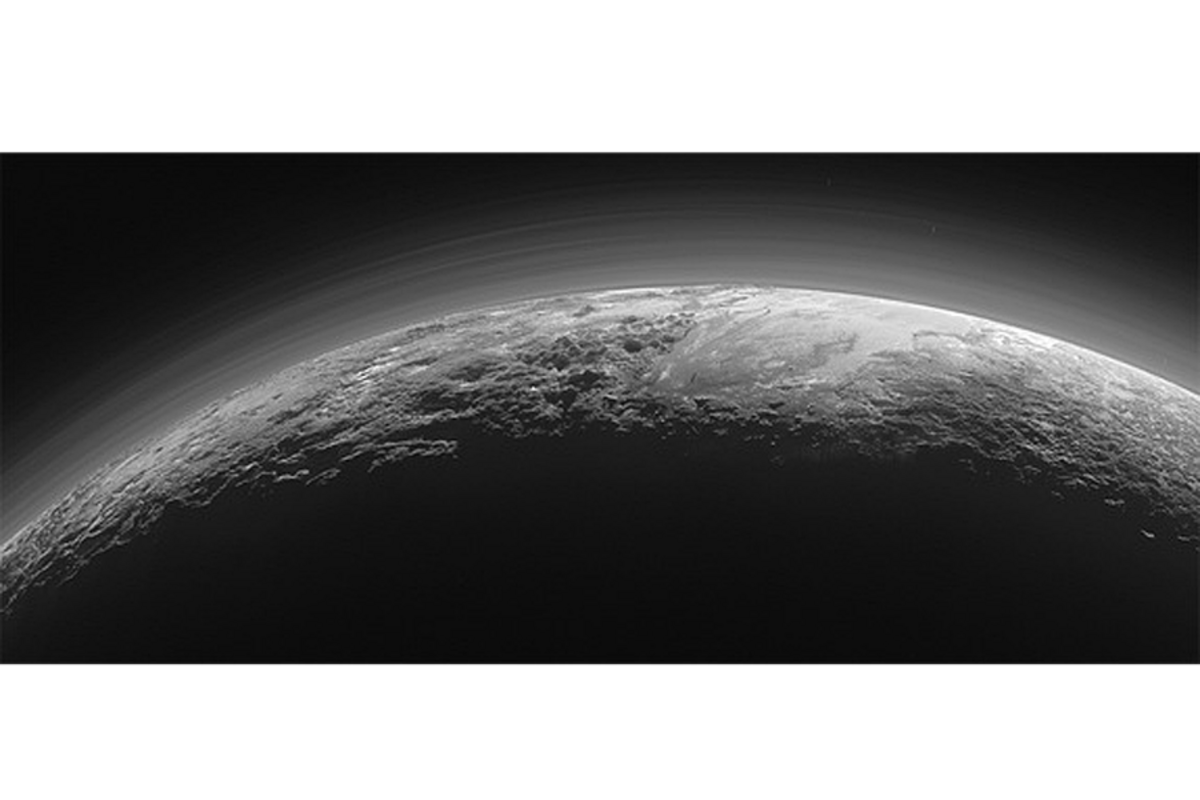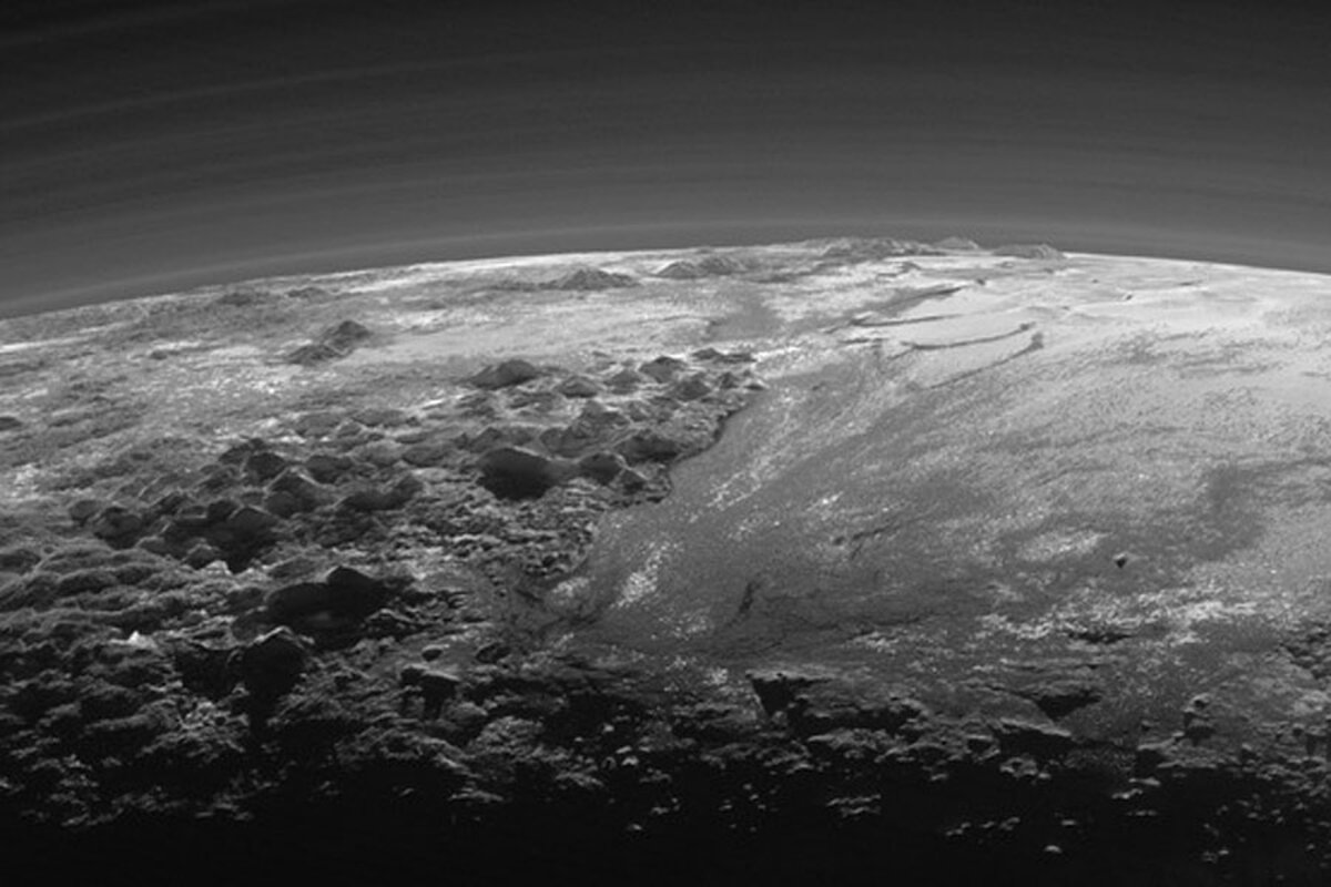 The photo, which New Horizons took during its epic July 14 flyby of Pluto,听. Towering ice mountains cast long shadows, and more than a dozen layers of the dwarf planet's wispy atmosphere are clearly visible.