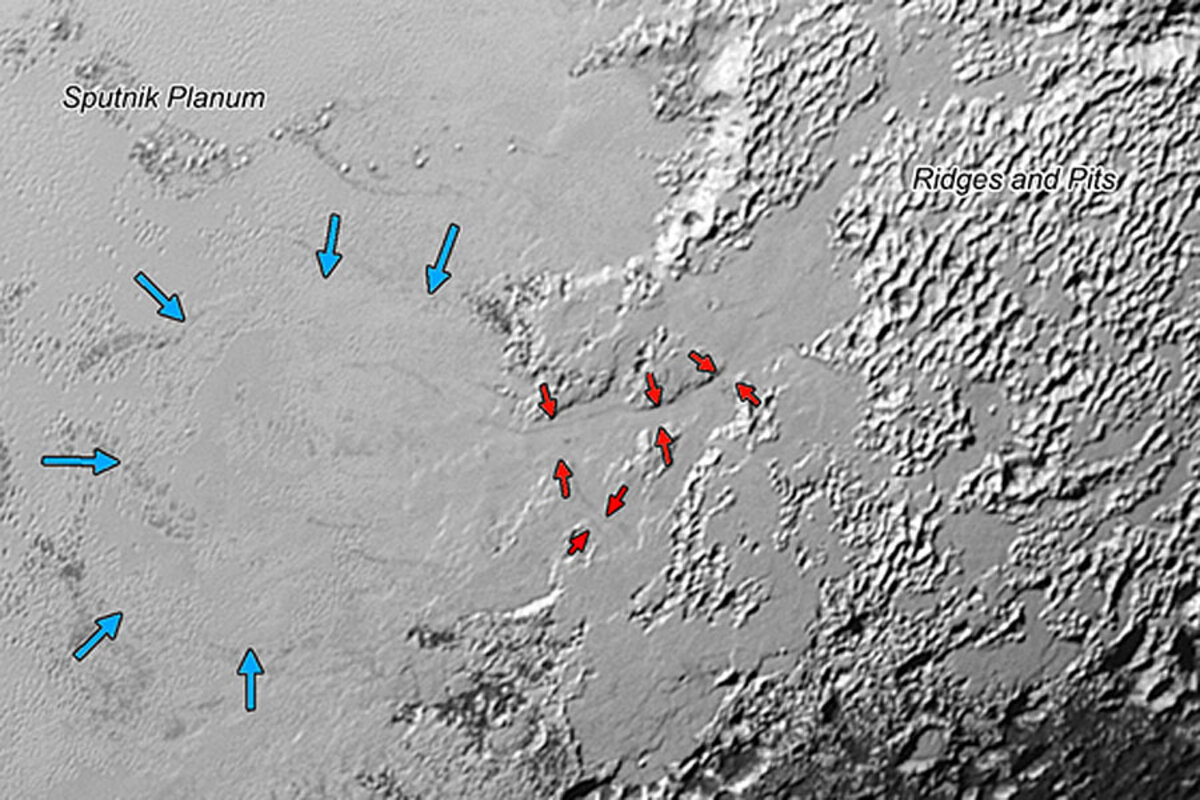 The new panorama and other recently downloaded New Horizons images also shed light on how ice 鈥斅爈ikely made of nitrogen and other materials rather than water 鈥斅爁lows into a vast, flat glacial plain known as Sputnik Planum. Some of Sputnik Planum's ice apparently evaporates, gets deposited in a region of rough terrain to the east and then flows back down into the plain as glaciers, via a system of valleys.