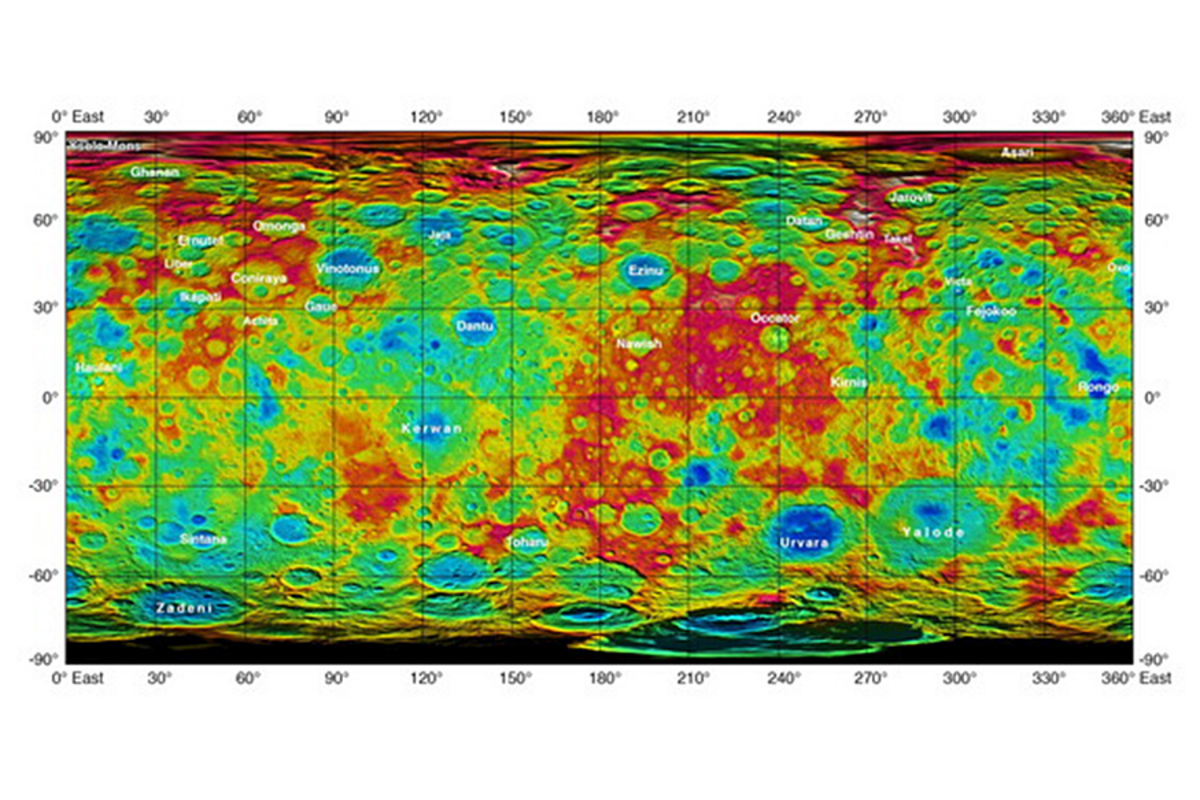 The new map also feature more than a dozen names for Ceres鈥 terrain recently approved by the International Astronomical Union. The new names such as Ysolo Mons for a 12-mile wide mountain near Ceres' north pole are all eponymous for agricultural spirits and deities from cultures all over the world.