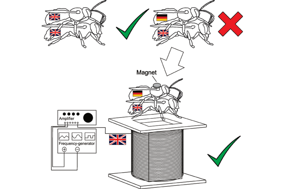 Conrad and the other study author, Manfred Ayasse,聽placed each pair of male and female bees on an inductor. 鈥淭he inductor was connected to an amplifier and a frequency generator,鈥 says Conrad. Then, she entered the signals, known from recording bees鈥 actual vibrations, in the frequency generator. That vibration pattern was transferred to the inductor, creating an electromagnetic field.聽