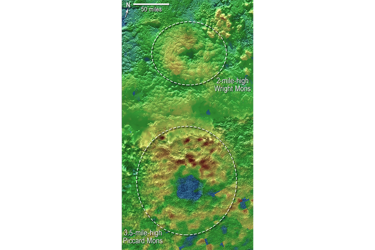 , spanning hundreds of miles across, sit at the southern edge of the heart-shaped region on the surface of Pluto. The mountains have been informally named Wright Mons and Picard Mons, and at their crests, each peak hosts a central crater, reminiscent of peaks called "" on Earth.