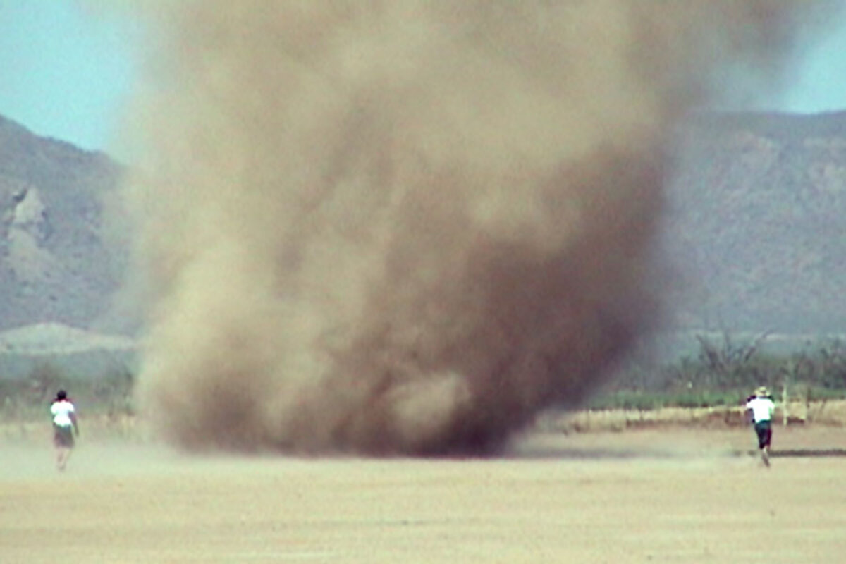 A vortex swirls over the surface, picking up dust as it goes. The spinning dust devil pulls at the ground, making it shake and tilt, and leaving dark, dustless streaks in its path.
