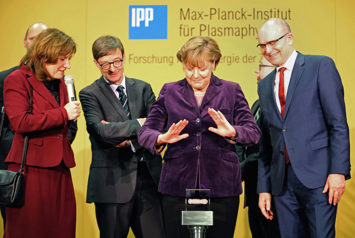 German scientists at the Max Planck Institute in Greifswald, joined by German Chancellor Angela Merkel, injected hydrogen into the Wendelstein 7-X fusion device and , according to the press release.