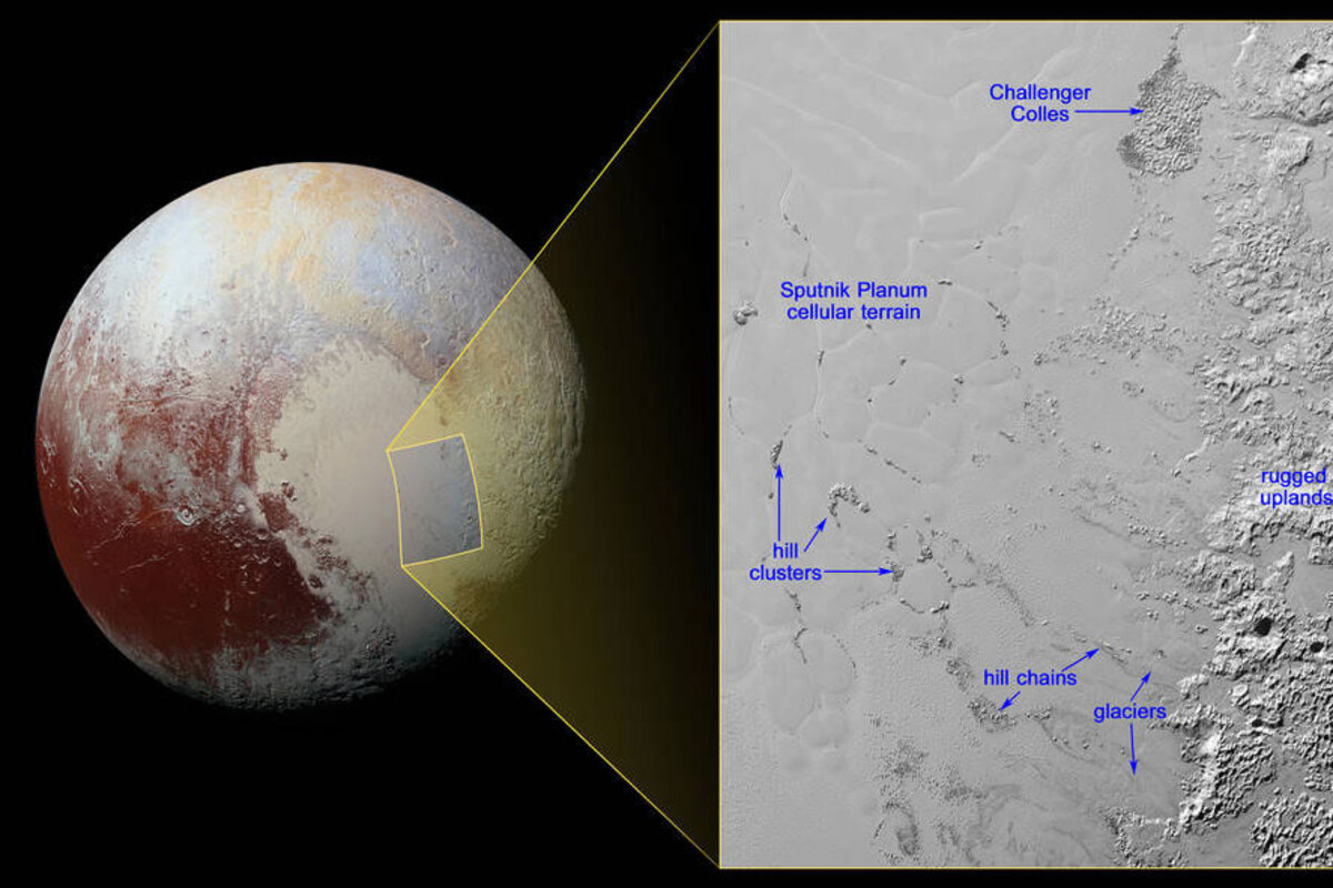Scientists hypothesize that nitrogen glaciers carried the hills into Sputnik Planum after they broke away from the rugged uplands. A newly released image show chains of the drifting hills along the flow paths of the glaciers, where they鈥檝e formed clusters that reach up to 12 miles across.