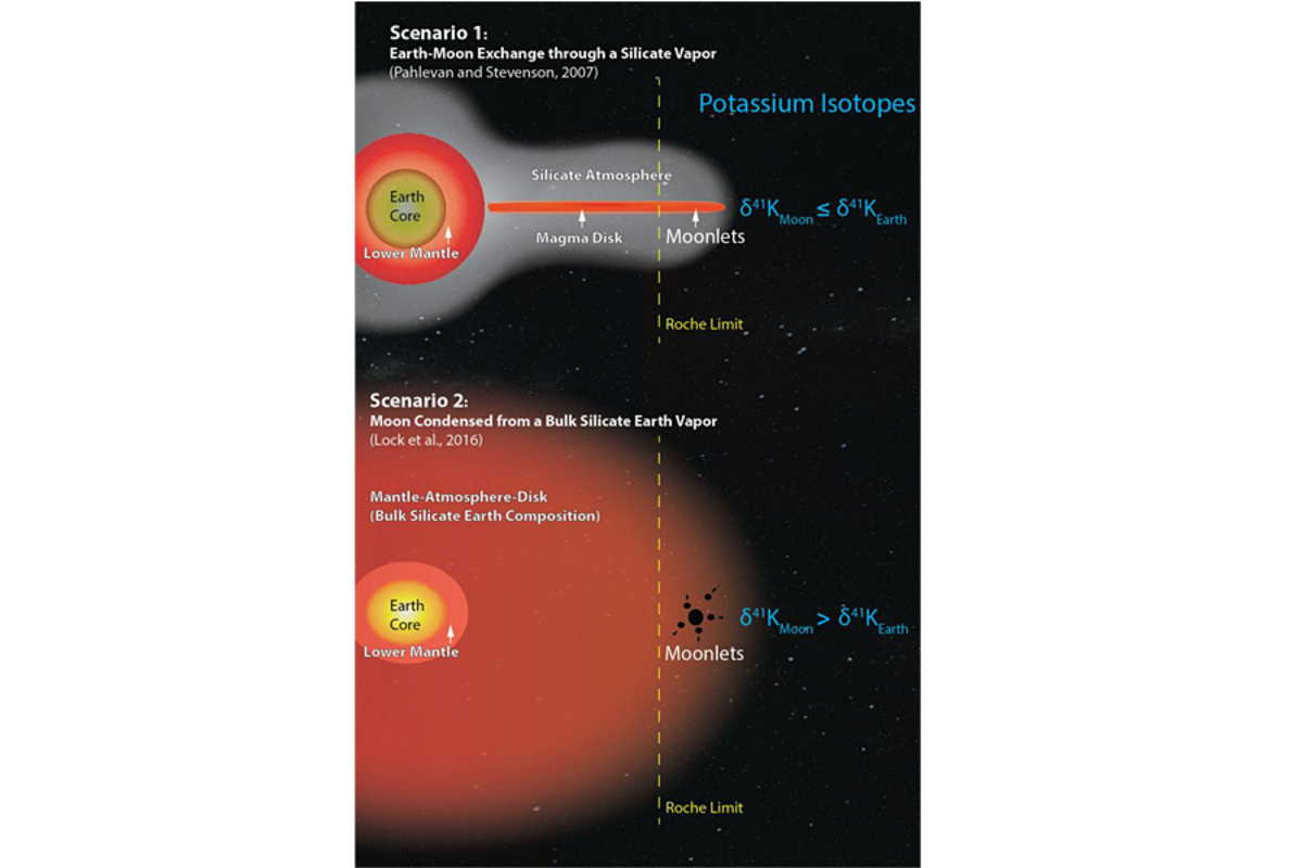 As that vapor began to cool following the high-energy collision, the melt that condensed out of it was made up of the heavier isotopes, such as potassium-41. That material eventually accreted into the moon and back onto Earth. Meanwhile, the lighter isotopes were still in the vapor. Although all of the isotopes were pulled back to Earth by its gravity, because the forming moon was at the edge of the system, the potassium-39 filled vapor didn't accrete onto it as readily.